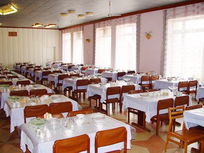 Пансионат состоит из нескольких многоэтажных корпусов - стандартные двухместные однокомнатные номера. Телевизор и холодильник находятся на этаже
